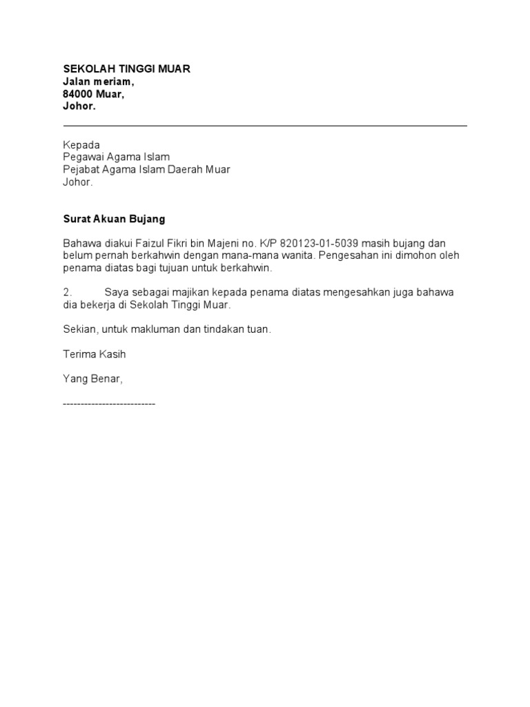 SURAT AKUAN BUJANG BAGI. Web Contoh surat akuan bujang dari majikan assalamualaikum bagi yang nak berkahwin yang tidak tahu macam mana nak buat surat akuan bujang dari majikan kat. Contoh surat akuan bujang negeri kedah kumpulan contoh cute766.